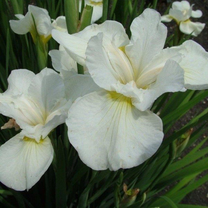 Ирис сибирский 'Сноу Квин' – это изысканное многолетнее растение, которое станет настоящим украшением вашего сада. Его элегантные белоснежные цветы с легким голубоватым оттенком и нежными желтыми прожилками создают впечатление воздушной легкости и чистоты. Высота растения достигает 65 см, что позволяет использовать его как в одиночных посадках, так и в групповых композициях.