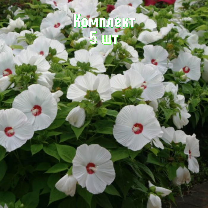 Этот комплект — 5 саженцев древовидного гибискуса белого по выгодной схеме «4+1». Взрослый куст приобретает древовидный силуэт высотой 1,5–3 м и шириной 1–1,5 м. Летом растение обливается крупными белыми цветками до 12 см с малиновым штрихом у основания и тёплым золотистым сердечком; цветение длится с июня по сентябрь благодаря постоянному образованию бутонов.