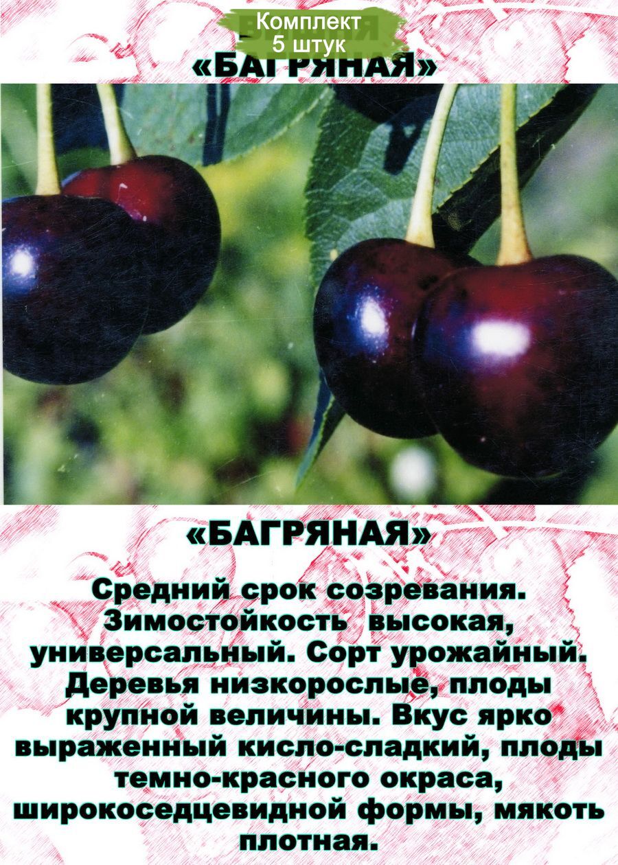Вишня сорта "Багряная Средняя" - это идеальный выбор для вашего сада. Эти саженцы отличаются высокой устойчивостью к болезням и морозам, что делает их подходящими для выращивания в различных климатических условиях. Плоды имеют насыщенный красный цвет и сладкий вкус с легкой кислинкой, что делает их отличным выбором для свежего потребления, а также для приготовления варенья, компотов и других заготовок.